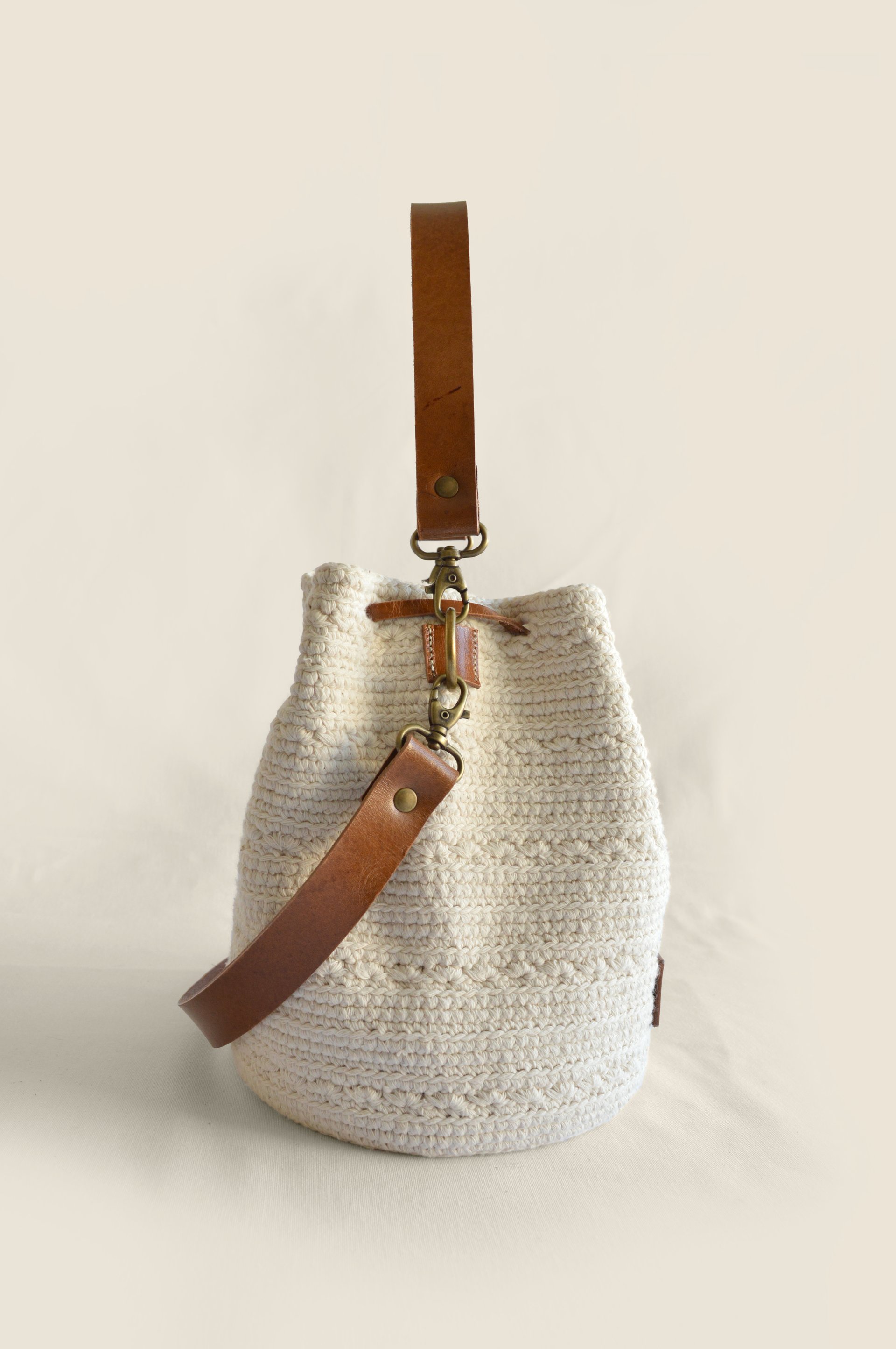 Bolso Cubo con correa de piel intercambiables 100% hecho a mano por hábiles mujeres indígenas de la región de los Andes del Ecuador. Tejidas en técnica de crochet con fibra vegetal de algodón y lana de oveja; terminados con cuero natural de alta calidad curtido artesanalmente.