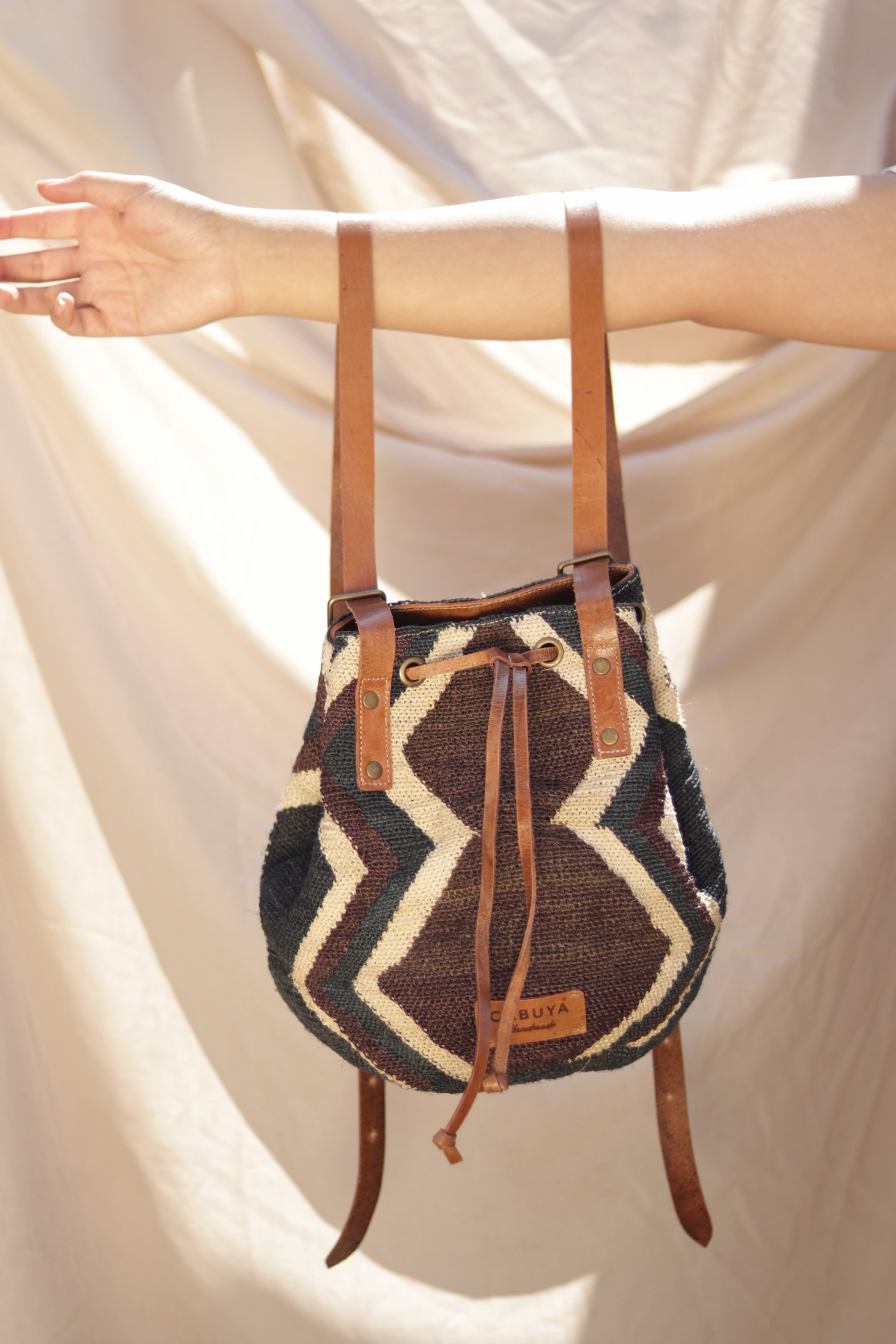 100% handmade backpack by indigenous women from the Andes region of Ecuador; woven with natural cabuya fiber with high quality straps made of natural leather hand-tanned.