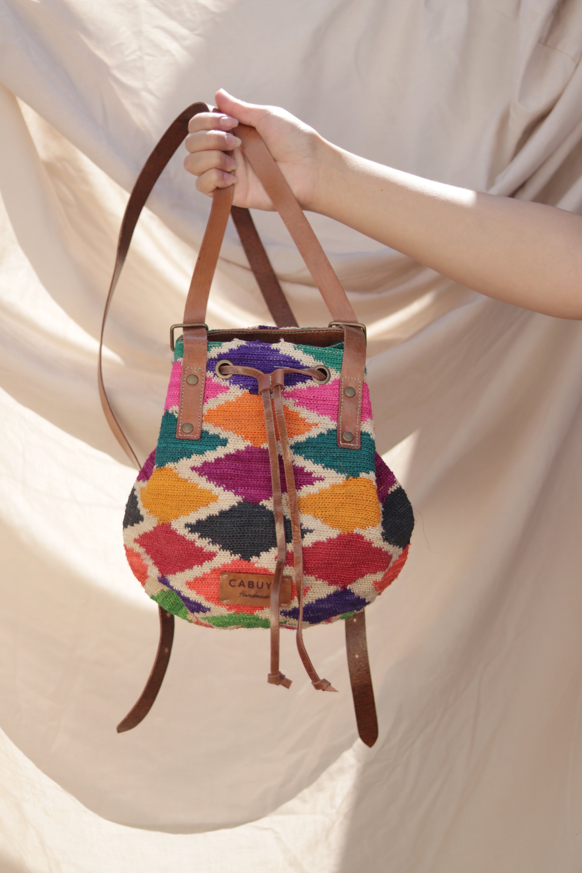 100% handmade backpack by indigenous women from the Andes region of Ecuador; woven with natural cabuya fiber with high quality straps made of natural leather hand-tanned.