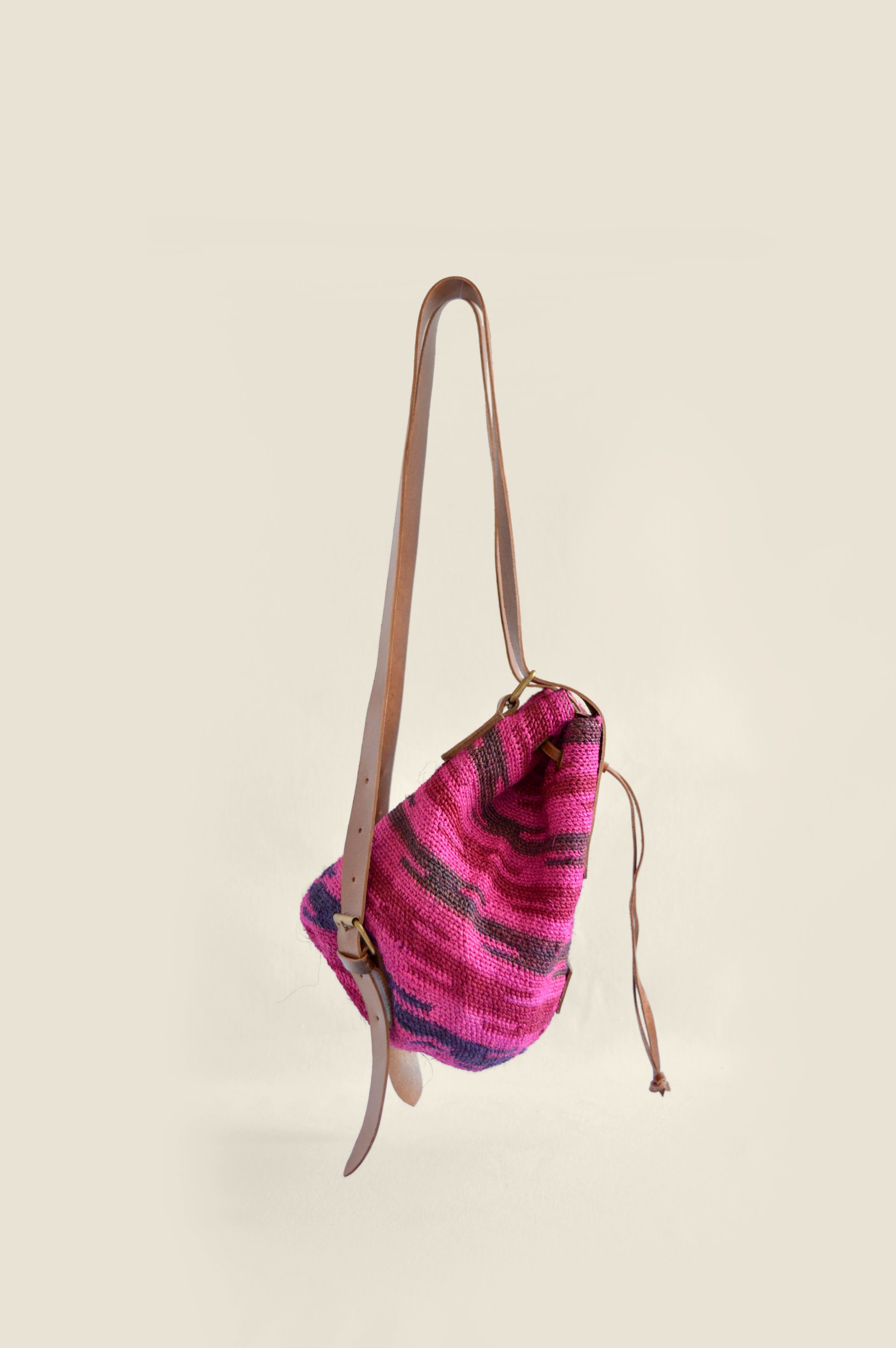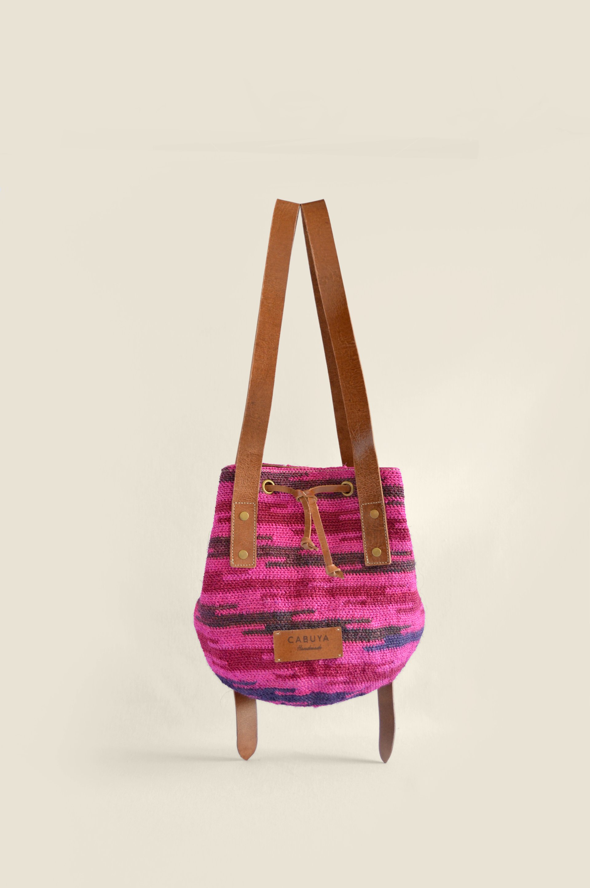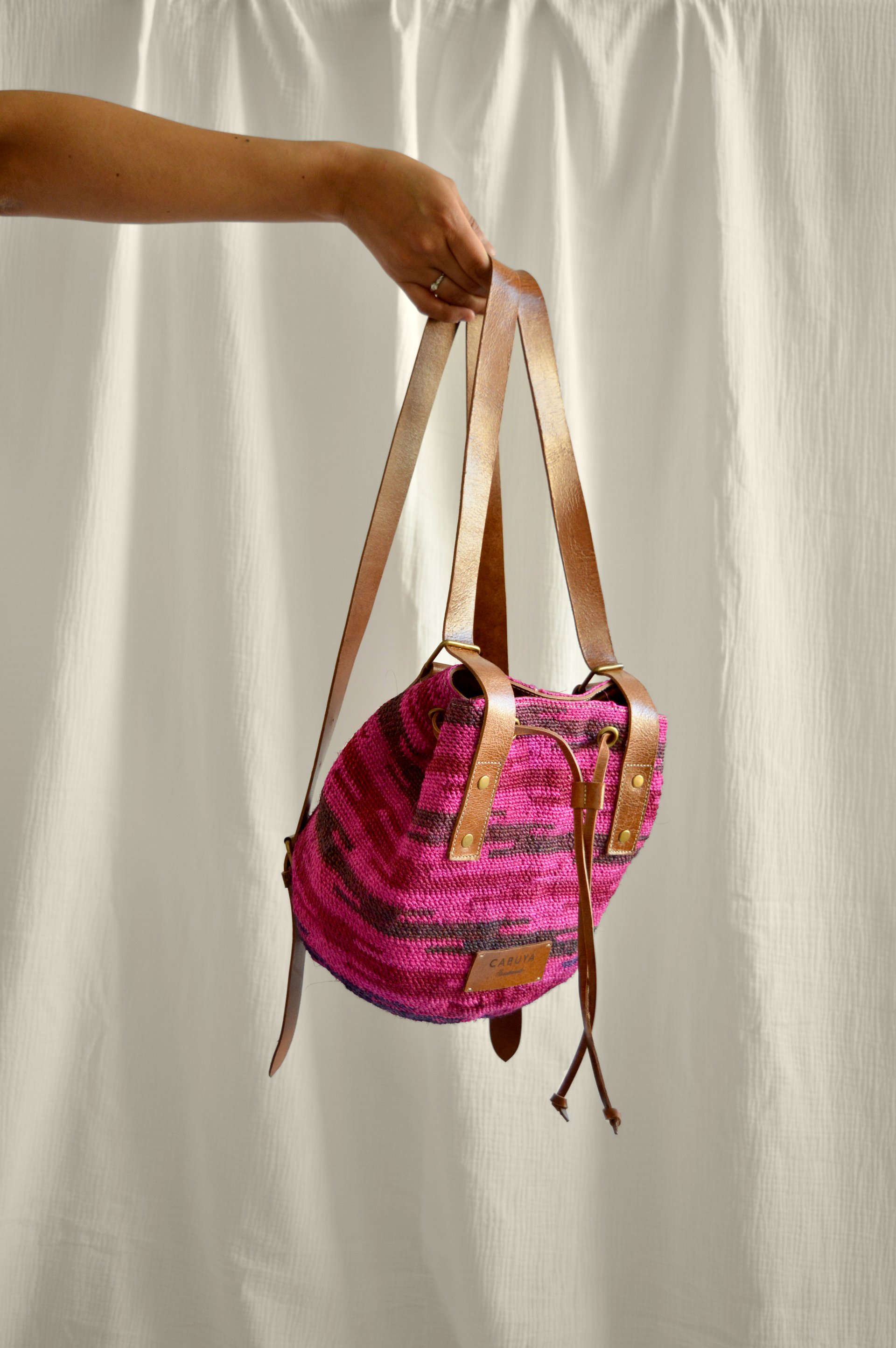 100% handmade backpack by indigenous women from the Andes region of Ecuador; woven with natural cabuya fiber with high quality straps made of natural leather hand-tanned.