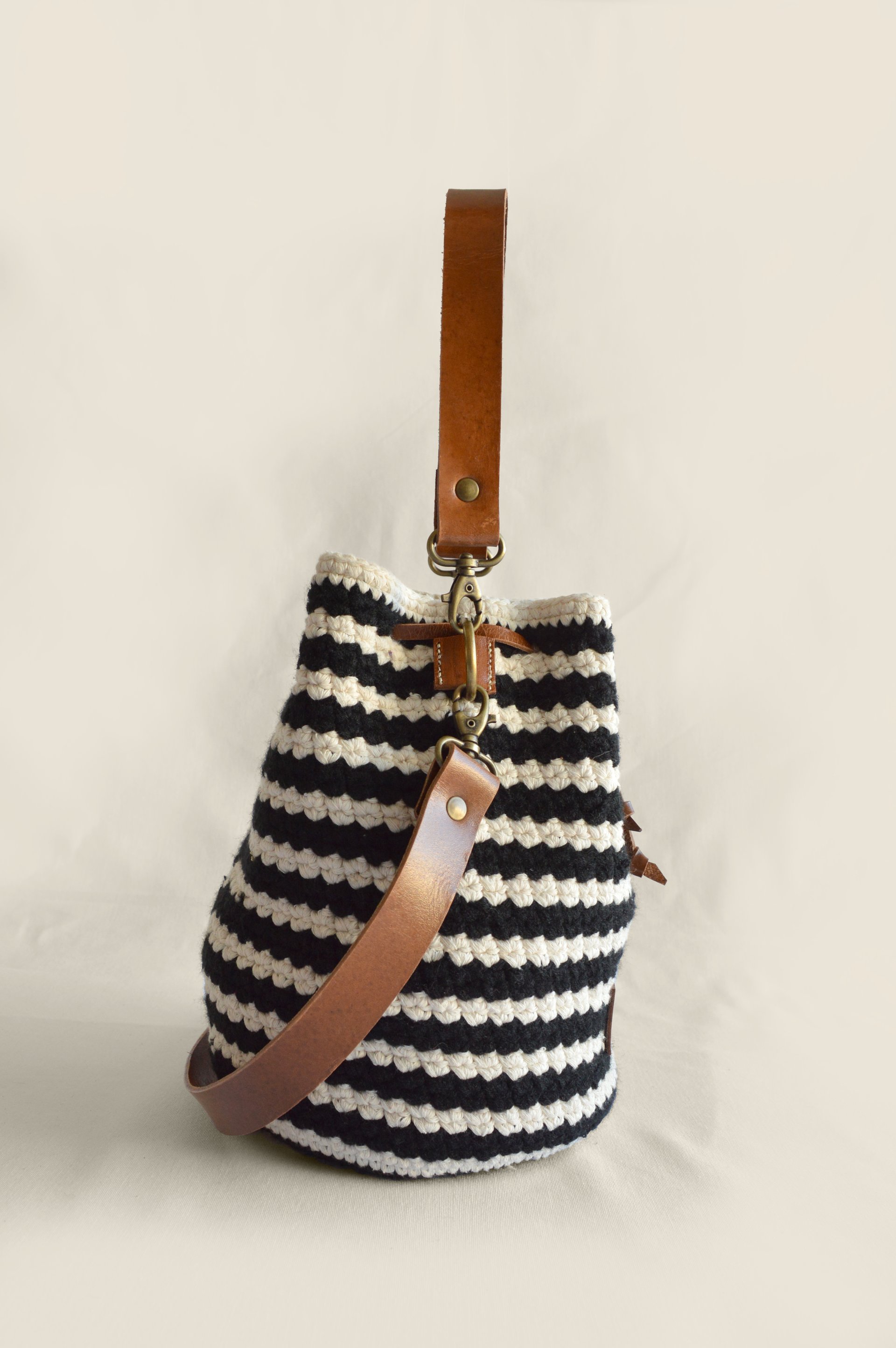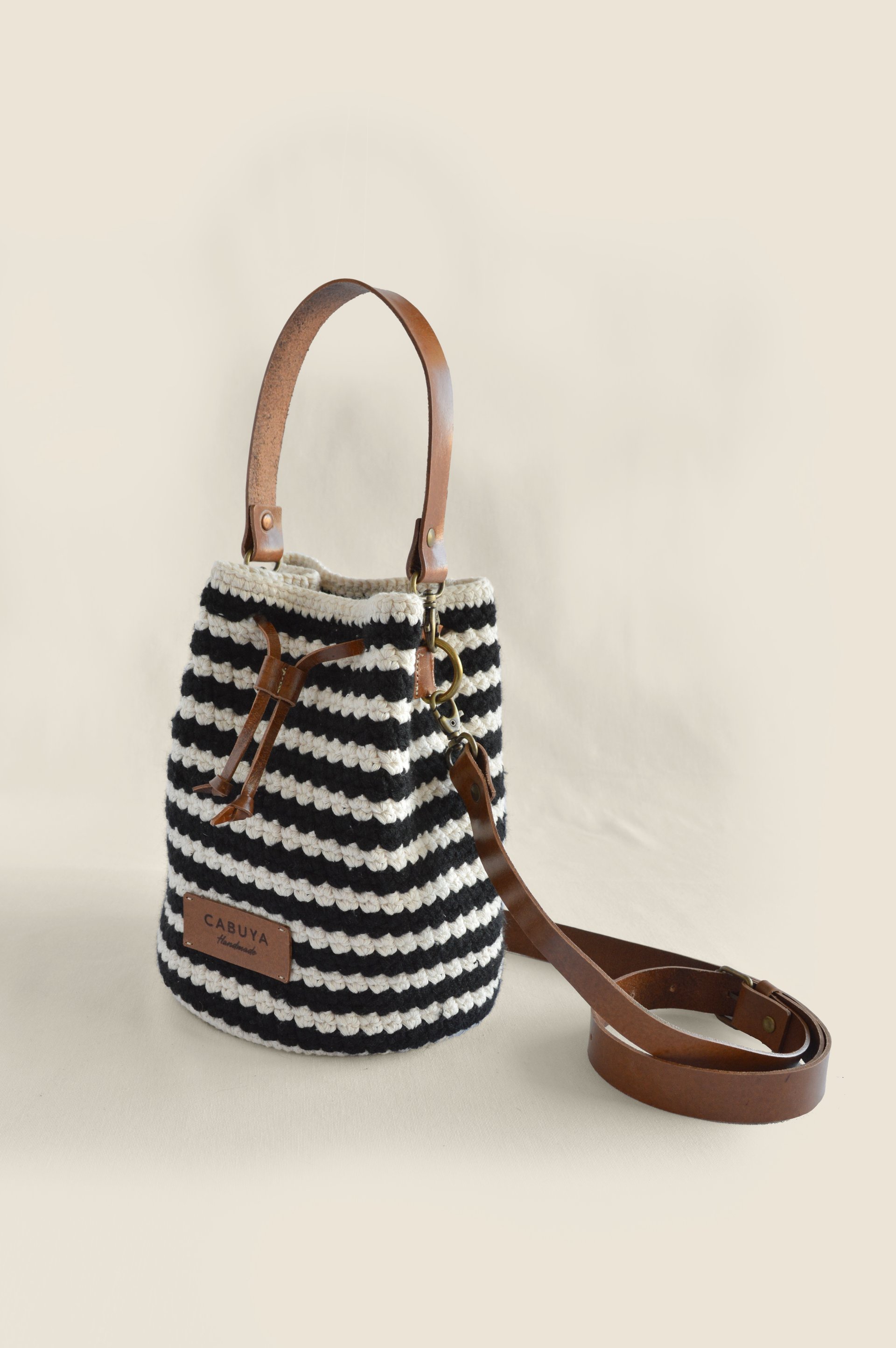 Bucket bag with interchangeable leather straps 100% handmade by skilled indigenous women from the Andes region of Ecuador. Woven in crochet technique with cotton vegetable fiber and sheep's wool with high quality straps made of natural leather hand-tanned.
